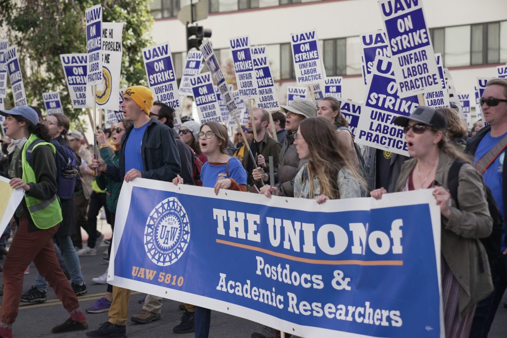 UAW Local 5810 members along with members of UAW Local 2865 (Academic Student Employees) and Student Researchers United-UAW have been on strike since November 14. UAW Local 2865 and SRU-UAW members have agreed to a mediation process with UC. While mediation proceeds, they will remain on strike.