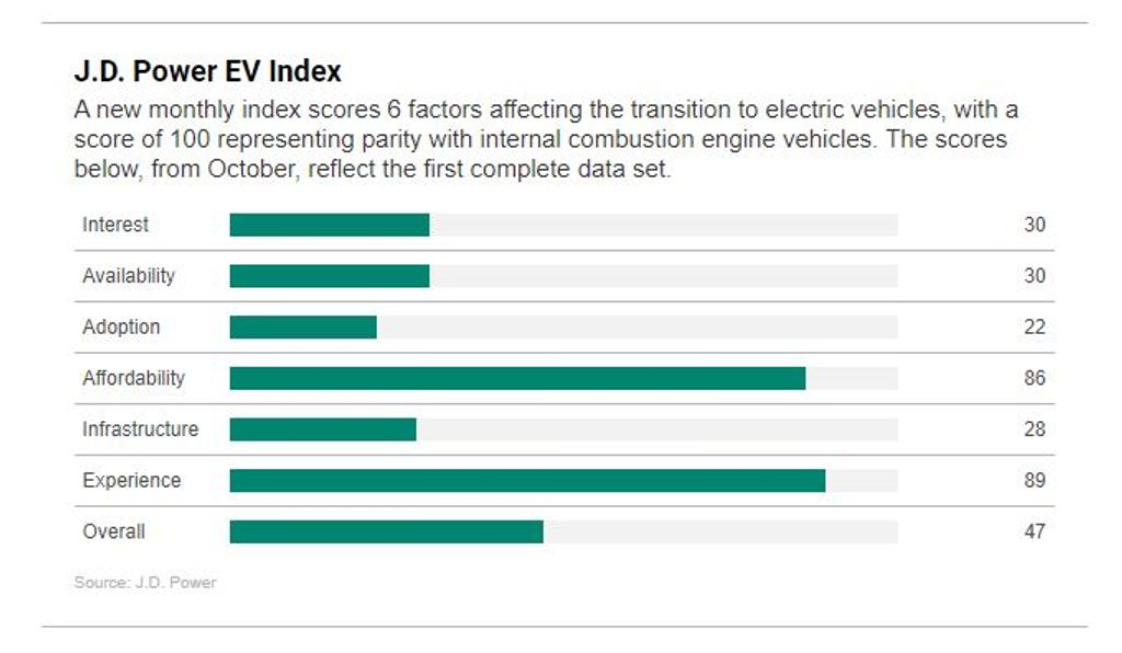 JD Power’s new EV Index looks at the progress of the transition from ICE powertrains the electric powertrains via millions of related data points. The publication will be tracking the data sets and updating the index on a monthly basis going forward. It pits EVs against gas cars in six categories: interest, availability, adoption, affordability, infrastructure, and experience.