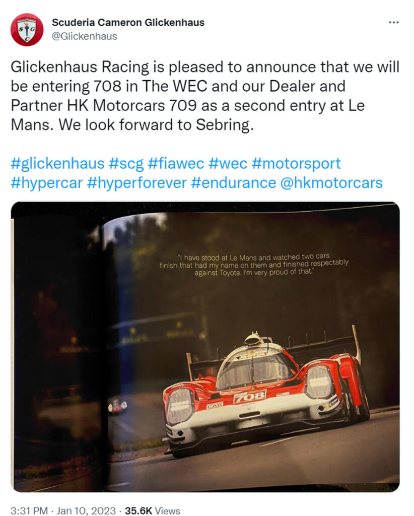 Glickenhaus said it will field a single 007 for the entire season, and its dealer partner HK Motorcars will field a second 007 exclusively in the 24 Hours of Le Mans.