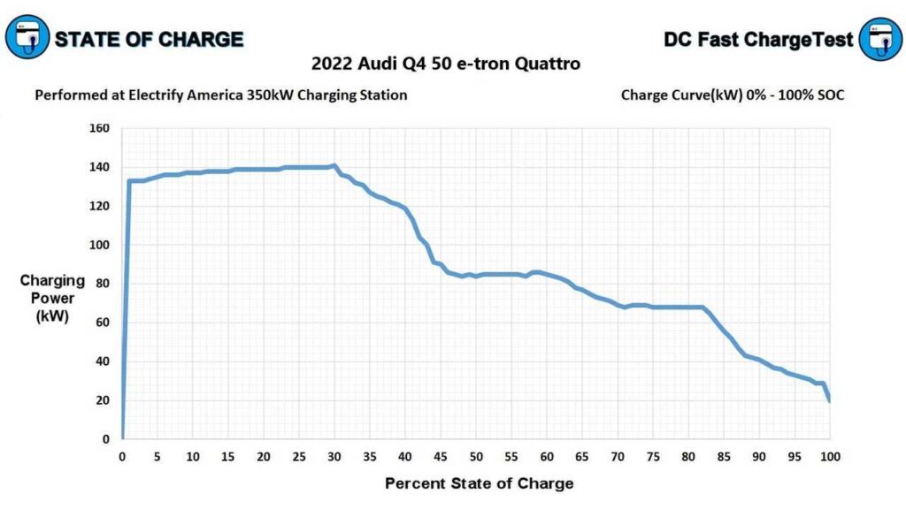 We never did see the 150 kW maximum charging rate during the recorded DC fast charging session in the video, as the peak charging power just touched 141 kW for a brief moment. So perhaps in ideal conditions, the Q4 E-Tron may even charge slightly quicker from 5% to 80% than Audi claims.