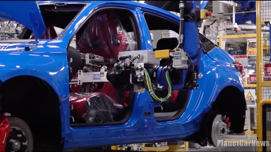 The video shows the entire assembly process in just about eight and half minutes, starting with the body shop, where sheet metal is pressed into body panels. Those pieces are then welded and bonded together to form the body shell, after which the hood, doors, and hatch are attached. The completed body shell is then painted.