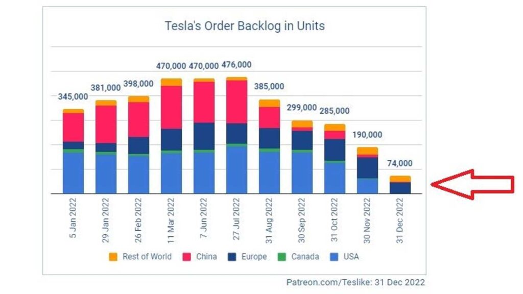 According to Troy Teslike, an invaluable source for Tesla stats and forecasts, the estimated order backlog as of December 31, 2022 was just 74,000 – down by 116,000 or 61% in just one month from 190,000 as of November 30. The decrease significantly accelerated in the last few weeks as the previous number was 163,000 as of December 8.
