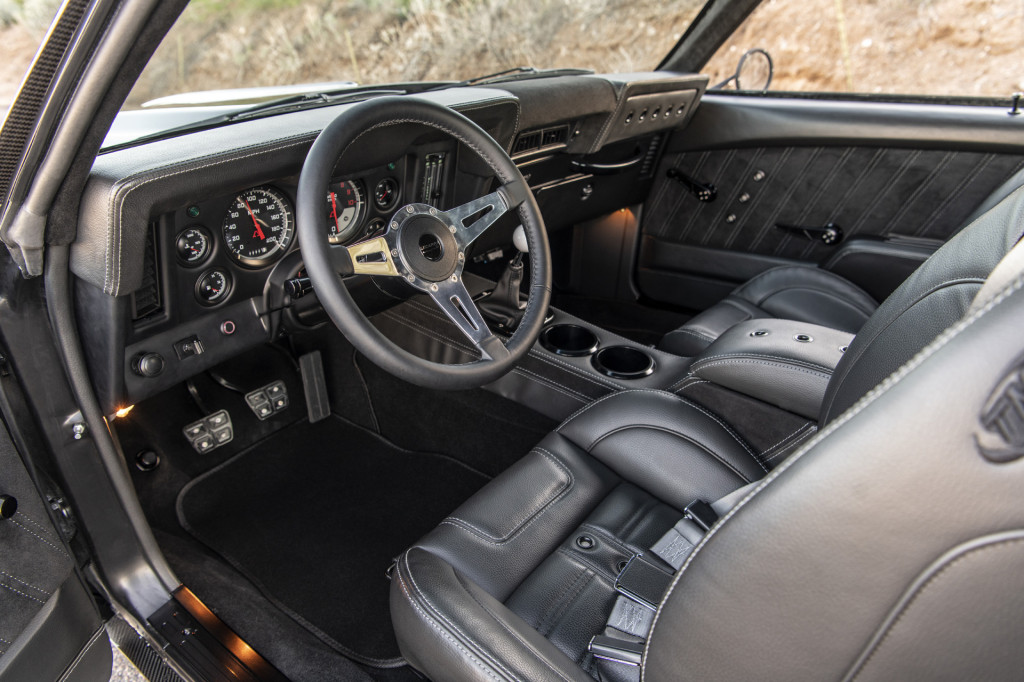 The engine sends its power through a Tremec T-56 6-speed manual, as well as a 9-inch rear with Positraction LSD and 31-spline Dutchman axles. Other components include front and rear sub-frames from Speedtech, coil-over suspension from JRi, and Wilwood brakes. The wheels are a three-piece design from Forgeline, and they measure 18×10.5 inches up front and 18×12 inches at the rear.