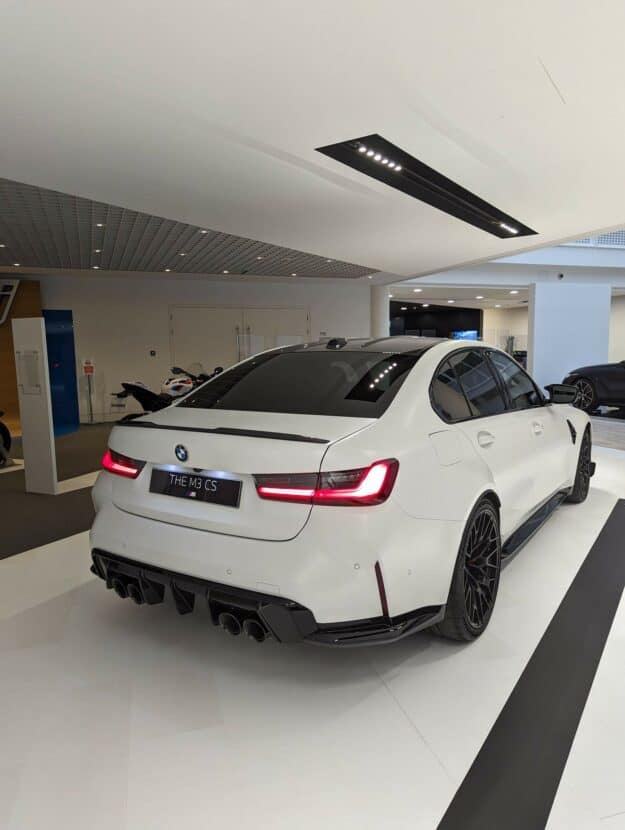 The matte paint is contrasted by red accents around the kidney grille to echo the hardcore coupe. However, the M4 CSL also has them surrounding the exposed carbon areas of the hood as well as on the roof, which isn’t the case here. That’s not to say the CS looks dull, even with this subdued white paint. Its striking appearance illustrates we’re dealing with the fastest and most powerful M3 in the nearly four decades that have passed since the original E30 was launched.