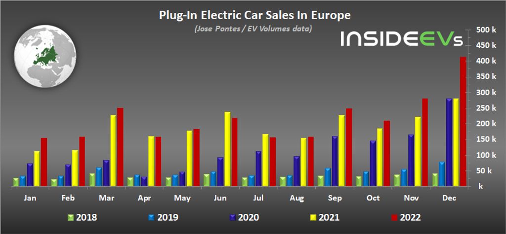 According to EV Volumes data, shared by Jose Pontes, 413,483 new passenger plug-in cars were registered in Europe in December (up 46 percent year-over-year), which represents 38 percent of the total market. We never saw such high numbers – the previous record was nearly 282,000 in November.