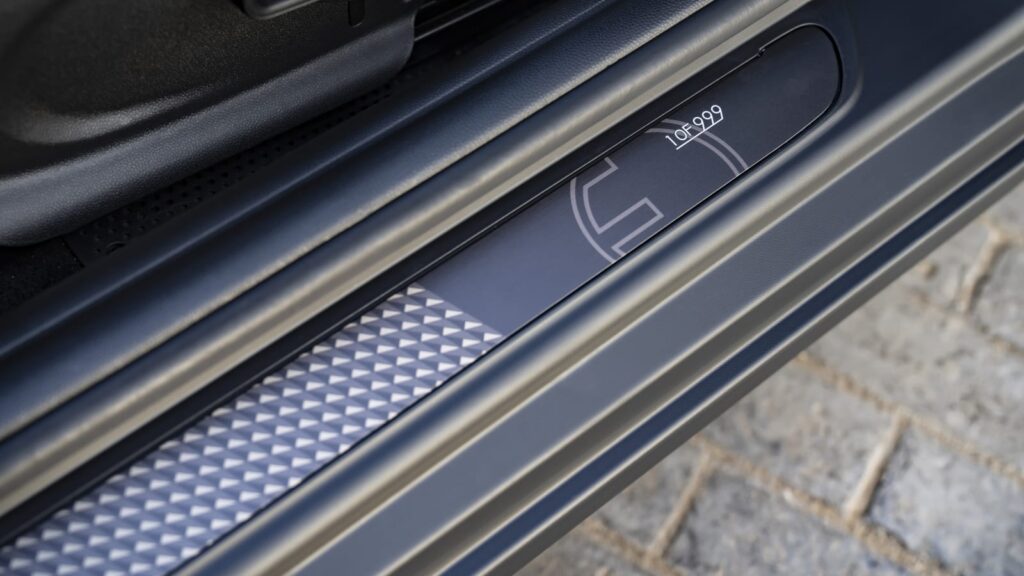 You’ll notice “1 of 999” lettering on the side scuttles, and if you open the door to look at the sills, the same “1 of 999” emblem is present again. The steering wheel gets an “E” badge, and the interior is only available in a single spec. Black leather and heated seats come standard, and the glossy black trim does, too. Yellow accents, the same as you get in the Hardtop, all emphasize the electric nature of the car.