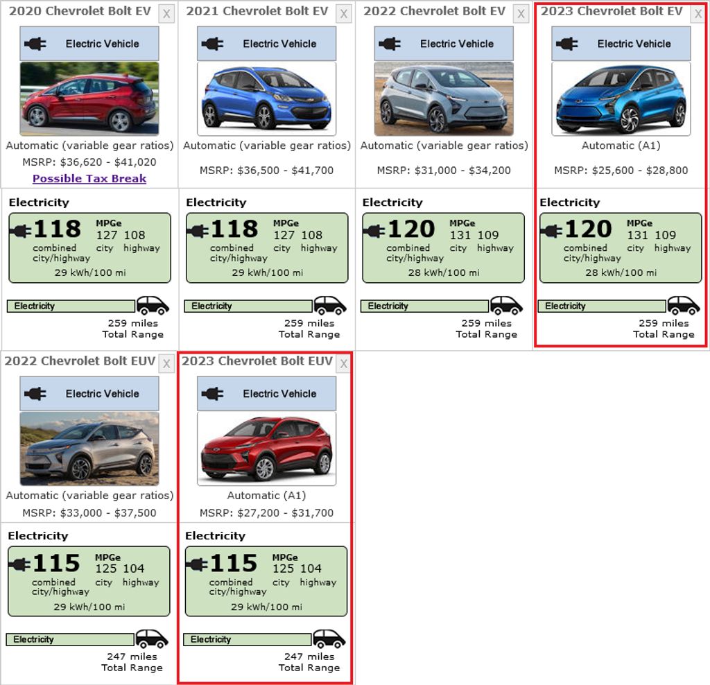 | 2023 Chevrolet Bolt EV 1LT 17-inch | FWD | 65 | 259 mi (417 km) |