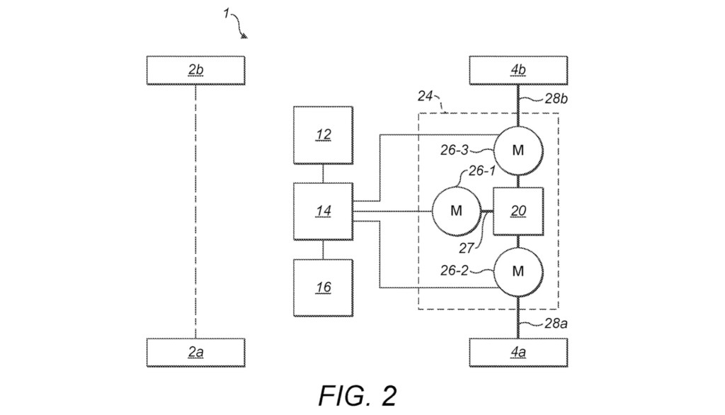 One patent application, published in January 2023 and first spotted by The Drive, describes a rear-axle drive unit consisting of a differential with three electric motors. A primary motor is positioned at the differential’s input, and two more are at the outputs, where the axle shafts exit and connect the diff to the rear wheels. The housing for this mass of motors and gears would be made of aluminum or magnesium to save weight according to the application.