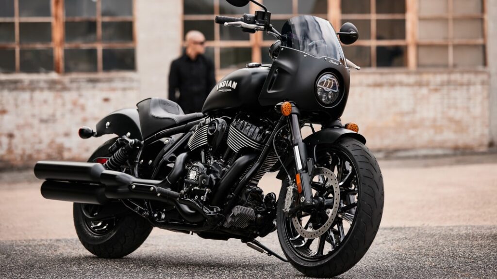Two years ago, Indian celebrated its 100th anniversary by reimagining the heart of the lineup, the Chief cruiser. Now that nothing is what it used to be, cruisers don’t need to be laid-back behemoths, they can be this, the 2023 Indian Sport Chief. The Minnesota bike maker calls it “the most aggressive iteration of the Indian Chief,” achieved by combining a more aggressive profile and top-shelf components that trickled down from the more expensive Indian Challenger bagger. The conventional element is the Thunderstroke 116 V-twin engine putting out 120 pound-feet of torque. Where “sport” in the motorcycle world usually means stripping elements, the Sport Chief picks up a quarter fairing around a new LED headlight featuring auto high beam detection and “corner gazing.” Behind that, new semi-flat, moto-style bars on machined triple clamps and six-inch risers stand over inverted 43-mm KYB forks with five inches of travel. Down in front, semi-floating, four-piston Brembos hug dual discs. There’s another semi-floating, two-piston Brembo caliper in back clamping a single disc. Pirelli Night Dragon tires wrap a 16-inch cast front in front, a 19-inch cast rear.