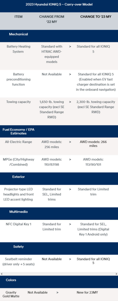 All-wheel drive versions will be rated at 266 miles (488 km), compared to 256 miles (412 km) previously. That’s 10 miles or 3.9 percent more, but we don’t know the nature of this particular update yet. The efficiency is higher, according to Hyundai’s website. The 2023 model year is not yet listed on the EPA website.