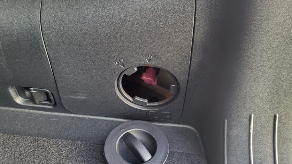 I open the cargo hold and darned if he isn’t right. There’s a circular cover on the passenger side of the trunk. Twist it, and there’s a purple button. It’s more of a level, really, and you have to pull it. This is a manual disengagement switch for the charger, the emergency release. Basically, if the charger gets stuck in your EV6, this decouples it.