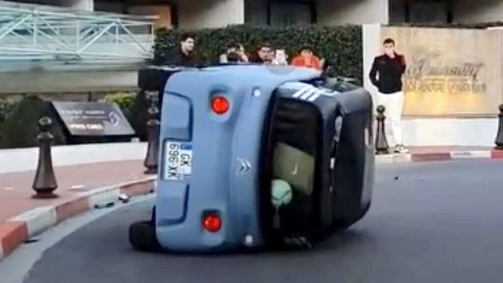 The Grand Hotel hairpin is one of the slowest corners of the Monaco Grand Prix, with F1 cars sometimes slowing down to just 30 miles per hour (48 kilometers per hour), so it’s no wonder a cube-shaped vehicle like the Citroen Ami went on its side because it was pushed too hard here.
