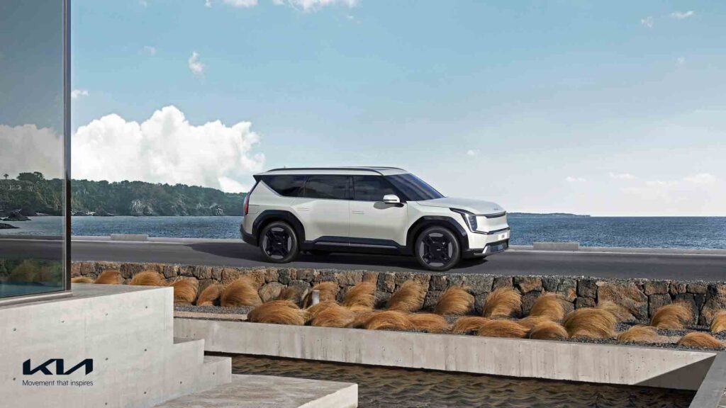 Kia provided a first look at its upcoming 2024 EV9 electric SUV, and it borrows extensively from the 2021 concept vehicle of the same name—including second-row seats that will pivot 90 degrees to the side for easier access or swivel around to face the third row. Full details on the luxurious EV9 are due later this month.