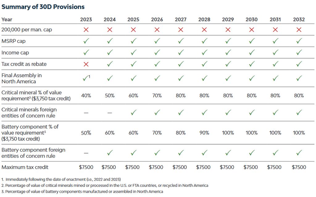 Those requirements will increase in the following years, as shown in an outstanding Fact Sheet IRA EV Tax Credits, released by Electrification Coalition and SAFE.