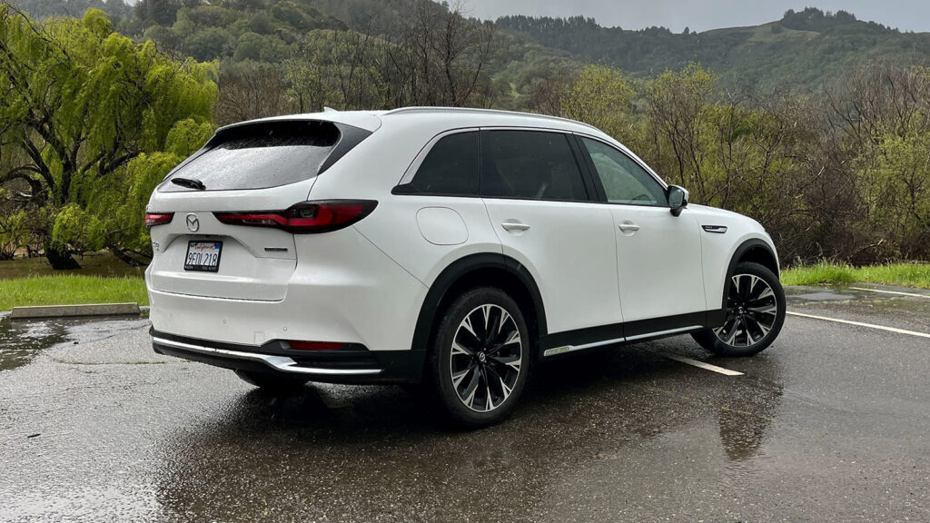 We only had the opportunity to try out the top-spec six-cylinder and the plug-in hybrid, and both impressed. The six is just as smooth as you’d hope, and it has a deep, gargling growl. But it does so with an indoor voice, so as not to disturb occupants. Mid-range power and torque are copious and with the quick-spooling turbo, you don’t have to wait long to get it. It’s a bit of a shame that it runs out of revs so quickly – redline is 6,500 rpm – because it’s a fun engine. But since power starts tapering off at the high end, it’s not like there was much more to get from spinning it higher. The 48-volt hybrid assist is more than just a slightly smoother start-stop system, too. Similar to various German luxury cars, it can completely shut off the engine when coasting, instead of waiting to come to a complete stop. Unlike Mercedes’ system, for instance, little pulses can be felt when the CX-90’s engine reengages, so a little more fine tuning could be in order there. The restarts from a complete stop could also be smoothed out. But on the whole, the six is sweet.