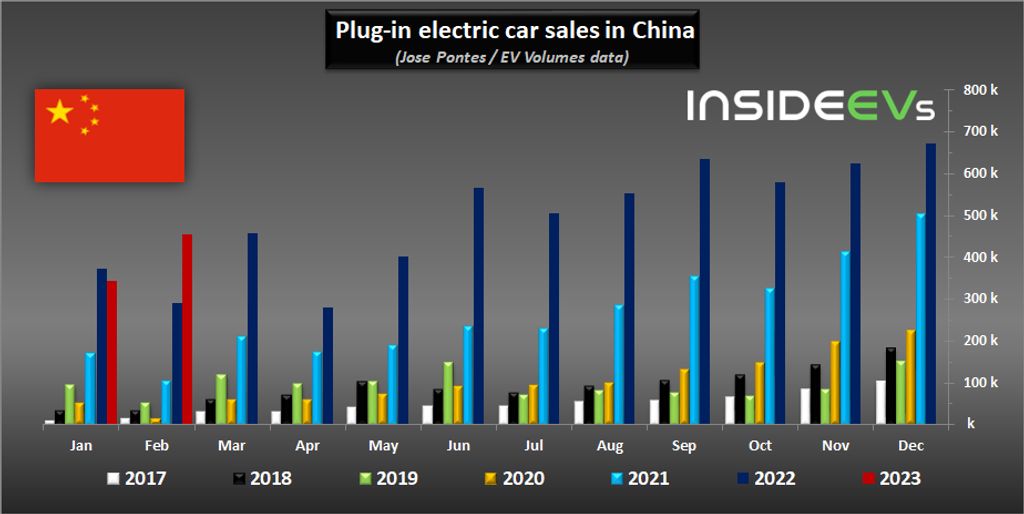 According to EV Volumes’ data, shared by Jose Pontes, some 454,591 new passenger plug-in electric cars were registered in China in February, which is 56 percent more than a year ago.