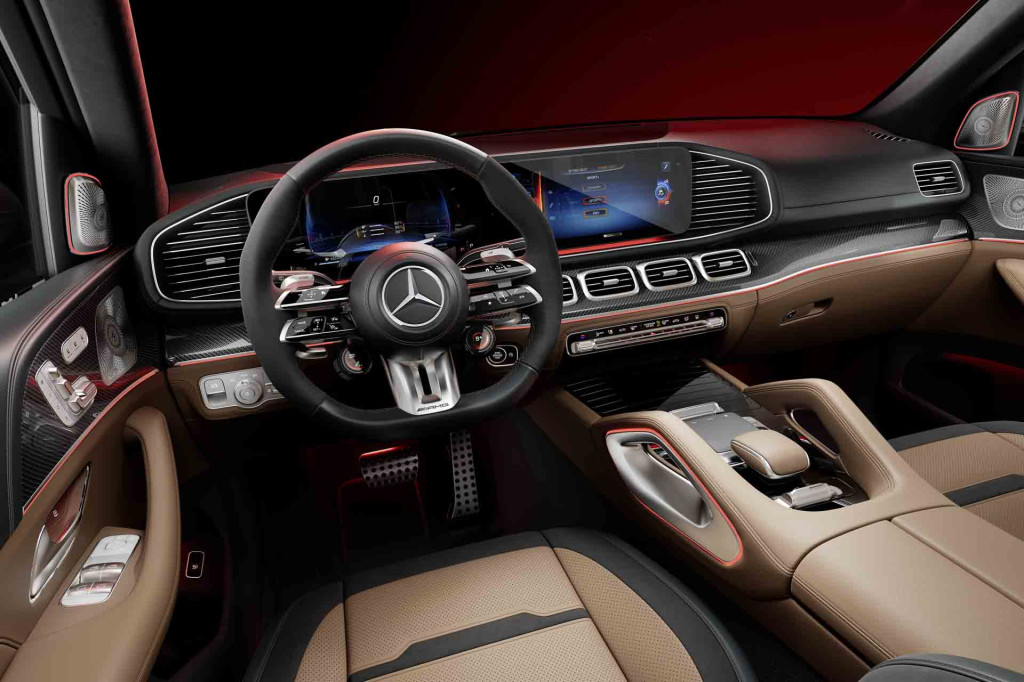 The changes inside include new color options for the standard leather trim, as well as new options for the dash accents, including some borrowed from the extra-plush Maybach GLS-Class. There’s also an updated version of Mercedes’ MBUX infotainment system which features graphics and functions unique to the AMG.