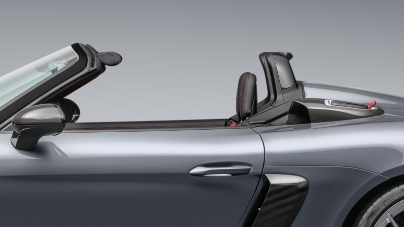 Porsche’s Active Suspension Management (PASM) is standard, as is the mechanical torque-vectoring limited-slip rear differential. Components from the Cayman GT4’s suspension were repurposed here as well and the fully adjustable setup carries over, from the ride height to the anti-roll bar stiffness. Porsche says the Spyder’s ride will be a bit more touring-oriented than the Cayman GT4’s to achieve a “more relaxed, characteristically convertible-style set-up.”