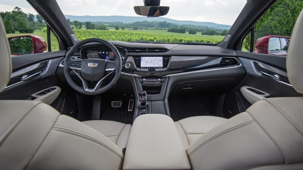 Every 2024 XT6 comes standard with forward collision warning, a low-speed automatic emergency braking system, lane-keeping assist, blind-spot and rear cross-traffic warning systems, and GM’s Safety Alert seat that buzzes your butt in response to inputs from the above safety systems. The Driver Assist package ($1,300) adds adaptive cruise control, higher-speed automatic emergency braking and reverse automatic braking. The Enhanced Visibility and Technology package adds GM’s rear camera mirror, a surround-view parking system (with a video recorder for security purposes), a head-up display and a rear pedestrian alert system when reversing.