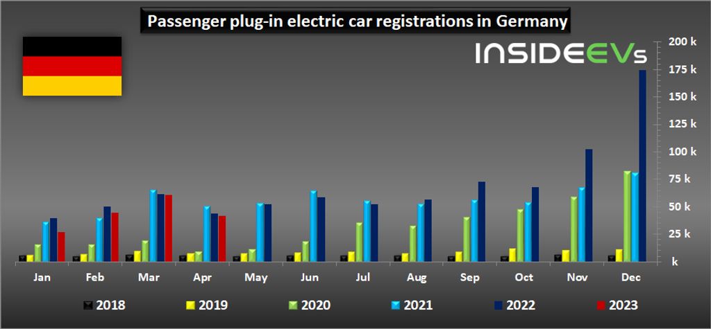 On the other side, plug-in hybrid car sales once again decreased. In April, only 11,787 units were registered (down 46 percent year-over-year), which is 5.8 percent of the market. That’s the fourth consecutive decline of such scale, caused by the end of incentives for PHEVs. Noticeable incentives for BEVs are still available (slightly lowered in 2023).