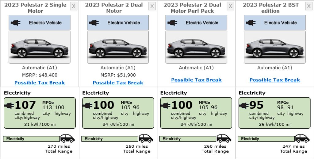 | 2023 Polestar 2 Single Motor 19-inch | FWD | 78 | 270 mi (434 km) |