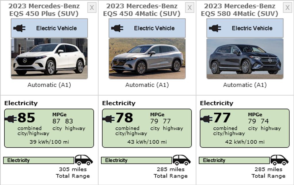 | 2023 Mercedes EQS 580 4Matic SUV (AWD; 21-inch) :: EPA Range rating by InsideEVs [Electric Vehicle 2-cycle label] |