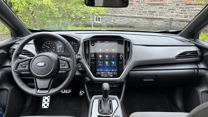 Interestingly, the Crosstrek offers two different infotainment screen setups. The base model makes do with dual/stacked 7-inch touchscreens. It’s an odd (and cheap) look, but you get wired Apple CarPlay and Android Auto functionality in the top screen. We still haven’t tested this version of Subaru’s StarLink infotainment, but we have tested the upgrade system. Opt for the next trim up, and you get the massive 11.6-inch vertically-oriented touchscreen with wireless Apple CarPlay/Android Auto. The screen’s surround is in a glossy black instead of the base model’s flat black look, but it still retains useful physical controls. For example, you can adjust the temperature and activate the defrosters via real buttons. The chunky volume and tuning knobs are appreciated, and the heated seats being activated by switches on the console is way better than other Subarus that stick the controls inside the screen. Oddly, the Crosstrek retains an aux port front and center under the touchscreen no matter the trim level, so good news for folks who hung onto their iPods.