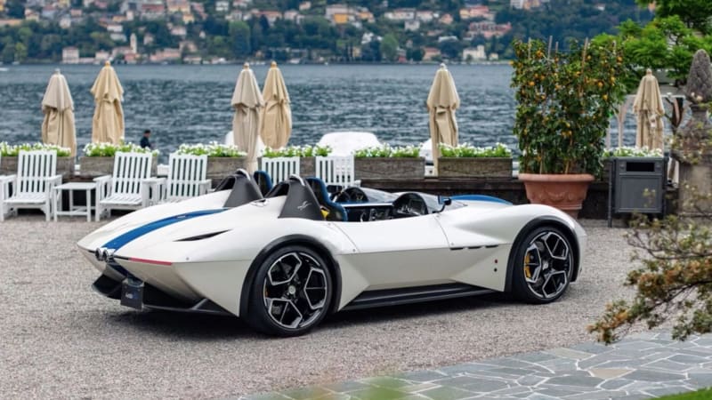The Kode61 references the Tipo 61’s unique architecture with elements such as a trellis-like center console. The low-slung open-top two-seater also features arched fenders like the original, though the new car’s body is shaped by carbon fiber. Beneath those tall arcs are three-spoke wheels that appear to be borrowed from the Maserati MC20 supercar. The Kode61’s blue-on-white paint scheme is a nod to American racing team Camerodi, known for campaigning the Birdcages (the Maserati MC12‘s paint scheme is a tribute to the same team).