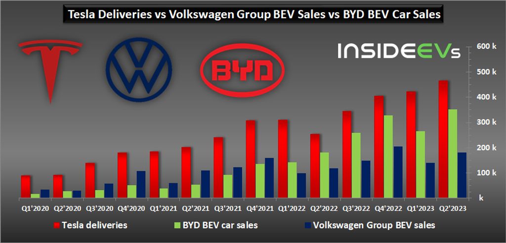 For reference, in 2022, Tesla delivered more than 1.3 million electric cars (an increase of 40 percent year-over-year), BYD sold over 0.9 million (up 184 percent) and Volkswagen Group over 0.57 million (up 26 percent).
