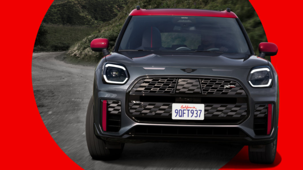 At the edges, breaks in the headlight DRLs turn them into a set of horizontal brackets. Further down, where the standard Countryman has small fog light recesses in the front fascia’s corners, the Countryman JCW has a pair of tall intakes topped by the bumper and flanked by side curtains. Chili Red accents on the curtains match the same color on the mirror caps and roof.