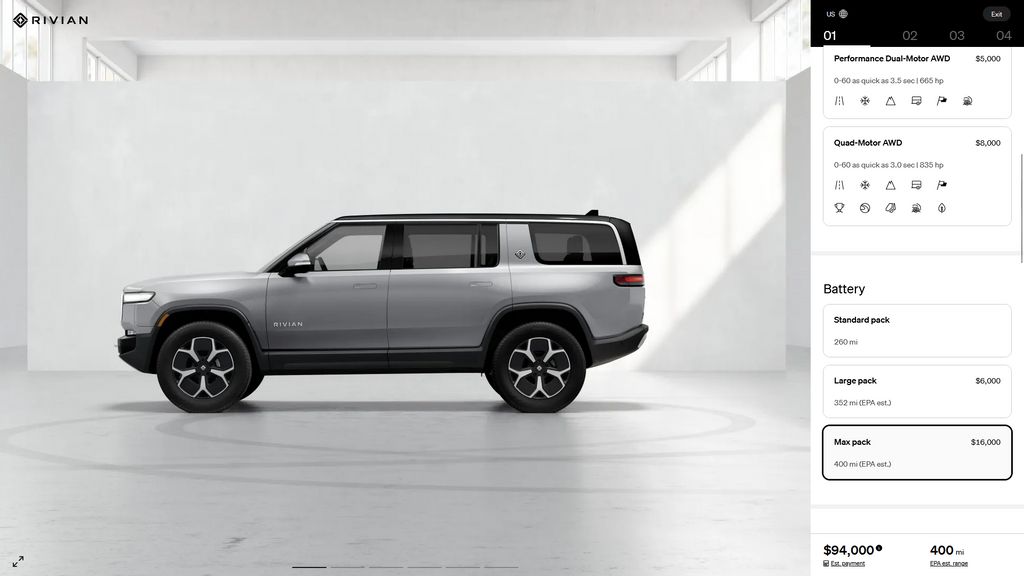 The Rivian R1S all-electric SUV can now be configured with the company’s new Max Pack battery that offers a maximum EPA-estimated range of 400 miles, according to the manufacturer’s official website, which was recently updated.