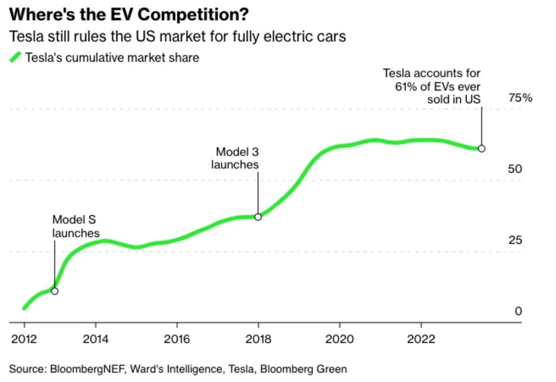 With just three months remaining, 2023 has been less a redemption story for legacy automakers than further evidence of their quagmire. In the US, Tesla has been expanding production about as fast as all of its competitors combined. The Austin, Texas-based EV maker accounts for 61% of fully electric cars ever sold in the US, making it more dominant in EVs than Apple is in smartphones.