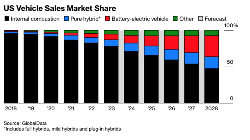 Hybrids continue to outsell EVs in the US, with sales approaching 1.4 million vehicles this year, versus nearly 1.2 million full electrics, according to GlobalData, which sees hybrids controlling 9% of the American car market in 2023, while full-electrics command 8%. Americans have been slower to adopt EVs than European and Chinese consumers because of the lack of charging infrastructure as well as the higher price of EVs, even after Tesla Inc. repeatedly cut prices this year. The average price of an EV in the US in August was $59,752, compared with $45,567 for models that run on gasoline, according to researcher Edmunds.com.