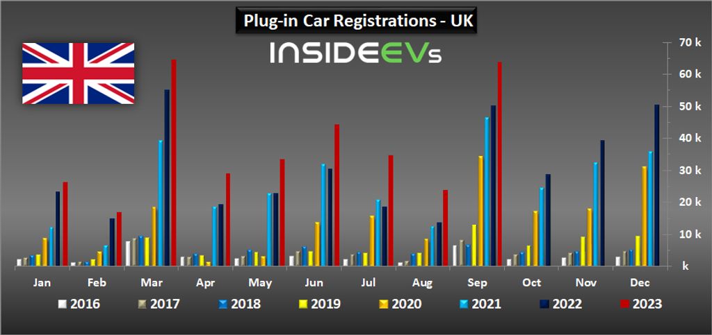 The Society of Motor Manufacturers and Traders (SMMT) reports that 63,858 new plug-in cars were registered last month (27 percent more than a year ago), which is 23.4 percent of the total market (compared to 20.4 percent a year ago). For reference, non-rechargeable hybrids noted 38,014 new registrations and account for 13.9 percent of the market.