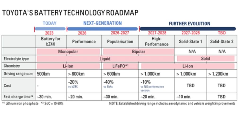 Toyota’s recently announced battery technology roadmap showed that the first generation of solid-state batteries to be fitted in its EVs will come around 2027-2028 and will enable a driving range of over 621 miles (1,000 kilometers) on a full charge, while a top-up from 10 percent State of Charge (SoC) to 80 percent will take approximately 10 minutes from a DC fast charger.