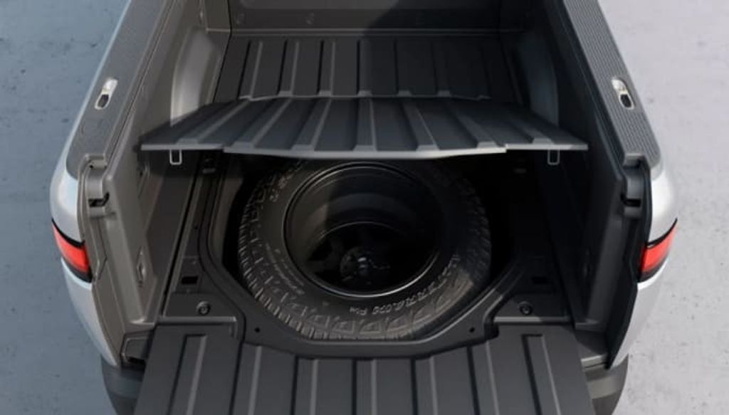 The sub-bed trunk is similar to the Rivian R1T‘s rear storage bin, but unlike the Rivian, it doesn’t seem to be large enough to fit a full-size spare tire in there. By the looks of it, the whole thing was filled with a single car cover like the one that was used several times to protect release candidate units in the past, either from bad weather or prying eyes.