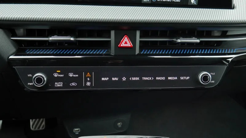 Despite the futuristic look, every variation of the EV6 cabin is still perfectly usable by people accustomed to the way cars operate now. There’s still a separate instrument panel, there are still traditional buttons and knobs, and even the touch-capacitive controls are better executed than those found elsewhere (cough, Volkswagen). Now, there is one wrinkle to that last bit, as the row of touch-operated buttons under the touchscreen serves double duty as climate controls and infotainment shortcuts – a swap button must be pressed to go between climate and infotainment (although the defrost and recirc buttons always remain in place). After thousands of miles spent driving our long-term EV6 (plus the similarly equipped Kia Niro and Sportage), some of our editors remain annoyed by them while others aren’t bothered by them at all. The main difference in opinion comes down to how often you adjust the climate controls. All at least agree that they provide a clean look, and we’re definitely seeing A LOT worse these days.