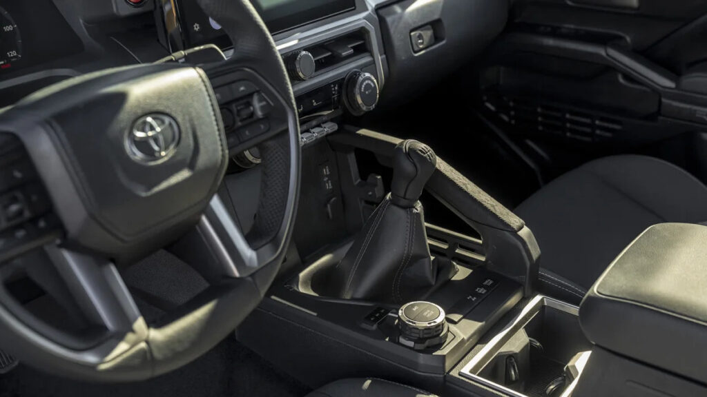 On the subject of the manual, don’t get too excited. It pains me to say this, but it should be avoided by all but the absolute, most diehard stick traditionalists. It has a ropey, balky shifter that’s worse than those of even some older trucks (I’m thinking back to the ’94 T100 I owned for a year). Worse is the mile-long clutch pedal travel and awkward engagement somewhere halfway in that travel. Coupled with bad rev hang on shifts, it’s hard to be smooth, and nothing about the operation feels fun. It does at least boast auto rev-matching that can be switched on or off, while boasting handy features like brake hold and clutch start cancel (for bump-starting on the trail to avoid rolling backward). Nevertheless, the automatic is far more pleasant and well-suited to the truck than the stick. This is not how you #SavetheManuals.
