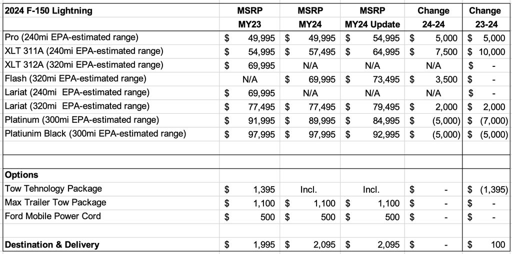 The 2024 Ford F-150 Lightning Lariat (ER) also is more expensive—by $2,000 compared to the 2023M and the initial 2024MY pricing—starting at $79,495.