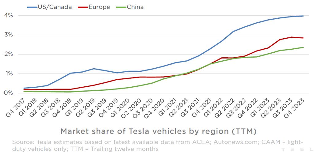 According to the industry data (trailing by twelve months), highlighted by Tesla in its Q4 financial report, the brand’s market share in the United States/Canada (counted together) recently reached 4%. That’s the highest level ever recorded, but there is now almost no growth, as the curve appears to be almost flat.