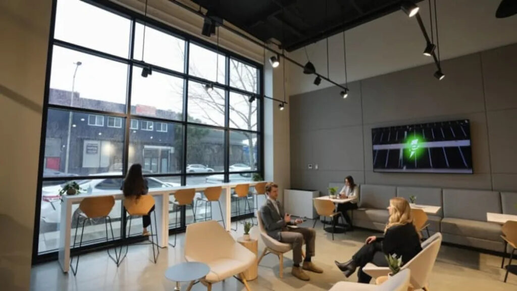 DETROIT — A couple of blocks from the San Francisco-Oakland Bay Bridge, Electrify America has opened an indoor charging station that lets drivers relax in a lounge while their electric vehicle batteries are being filled up.