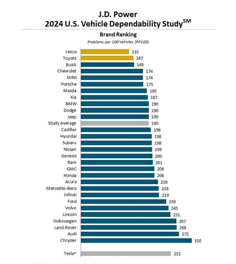 The study found that the owners of battery electric vehicles and plug-in hybrids experienced far more problems than gas cars. On average, ICE cars experienced 187 problems per 100 vehicles, PHEVs witnessed 216 problems, while BEVs fared far worse with a score of 256 problems per 100 vehicles over three years of ownership. Lexus and Toyota were the least troublesome—which is hardly a surprise—while Tesla fared rather poorly.