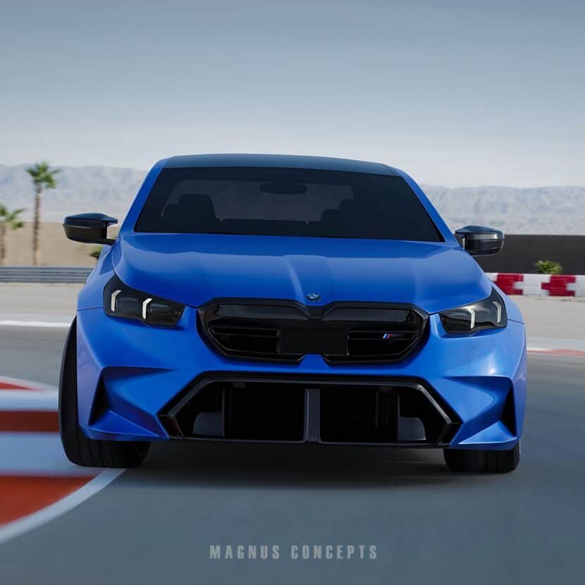 With spy photos hinting at the front design and leaks revealing the rear, the artist updated the renderings to reflect the latest insights. The front end borrows heavily from the i5 M60, aligning with BMW’s strategy to bridge the gap between M Performance models and the flagship M5. The design features distinctive lights and a kidney grille reminiscent of the i5 M60, complemented by a bold front fascia with large air intakes and air curtains, set against the striking backdrop of a matte blue paint. The grille, with its horizontal bars, nods to BMW’s Motorsport heritage, though the front radar remains prominent.