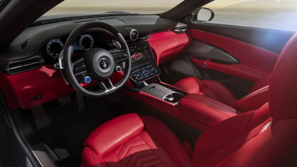 Maserati is only offering the GranCabrio in the top-spec Trofeo internal-combustion trim for now. That includes the twin-turbo 3.0-liter V6 making 542 horsepower and 479 pound-feet of torque, eight-speed automatic transmission and all-wheel drive. The weight does ever so slightly blunt acceleration, dropping it by 0.1 second to 3.6 compared to the GranTurismo Trofeo. The same staggered 20-inch front and 21-inch rear wheels and Brembo brakes carry over from the coupe, too. And while the Trofeo is the only version for now, Maserati notes that the chassis remains designed for internal combustion and electric power, so an all-electric Folgore and more entry-level Modena gas-powered models will likely be added later.