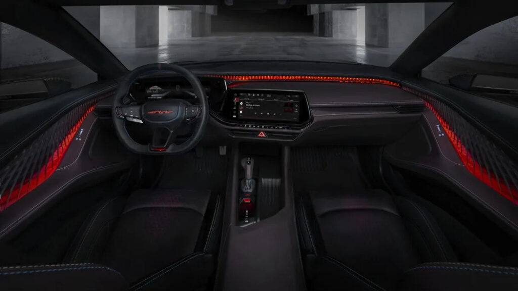 All we have to go off of so far is the Charger Daytona SRT Concept, but it didn’t exactly have a fanciful show car interior. It looked awfully close to production. It features a dual-screen setup, one landscape-oriented touchscreen for the infotainment system (running what looks like Uconnect 5) and another large screen for the instrument cluster. The LED lights surrounding the cabin would be the most fanciful element, and although we have doubts that they’d be the same on the production car, it wouldn’t be a total surprise. The steering wheel looks legit with a number of buttons on both spokes, and it looks like Dodge is sticking with a traditional gear lever for shifting duties, too. It generally toes the line between evolution and revolution of the outgoing Charger’s interior. You’ll definitely be able to tell it’s fresh and new, but the layout shouldn’t offend the muscle car buying masses.