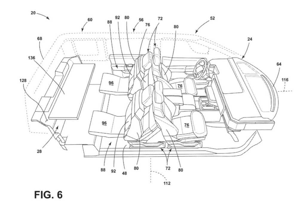 In one configuration described in the application, the front seats could be moved forward and fold-out bottom sections deployed, which would allow front-seat occupants to sit facing those in the second row. In three-row vehicles, the second row could in turn be configured so occupants could sit facing the back, with the third row converted into a table, one drawing included in the application shows.