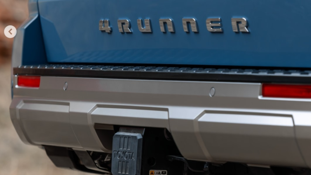 On an Instagram slideshow asking followers to identify a 4Runner’s model year, the final image shows part of a rear end we’ve never seen before in what looks to be a color similar to the new Land Cruiser’s Heritage Blue. The differences we can identify for now are new, trimmer taillights, a smoother tailgate with a redrawn handle pull and license plate area, a squared-off bumper with red reflectors and metallic-looking trim instead of a body-color finish. The 4Runner logo has been moved from the hatch pull crossbar to just above the bumper, the “R” in 4Runner now the same height as the following letters. Familiar lines remain, too, such as the basic outlines of the rear fascia that we can see, the horizontal indentation beneath the taillights, and the crease just above the bumper.
