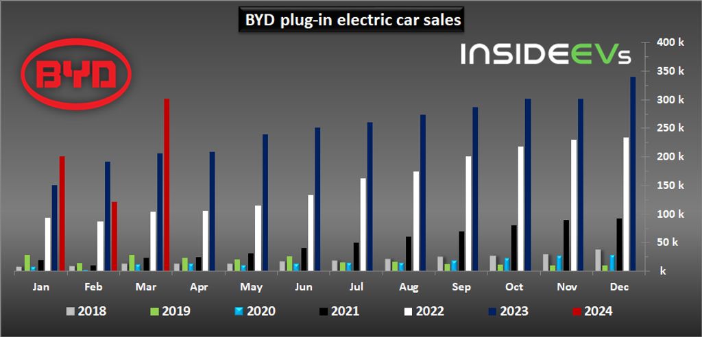 For reference, in 2023, BYD sold over 3.0 million passenger plug-in electric cars, which was 62% more than in 2022. In 2023, BYD became the largest Chinese carmaker and the largest car brand in China.