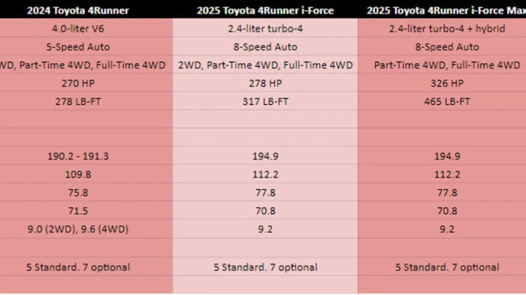 You see, we’ve pulled together the numbers on both the new 4Runner and the new Land Cruiser, plus the old Toyota 4Runner for good measure. We’ve put them all in a convenient table above. And, well, the 4Runner and Land Cruiser seem even closer than we were expecting.