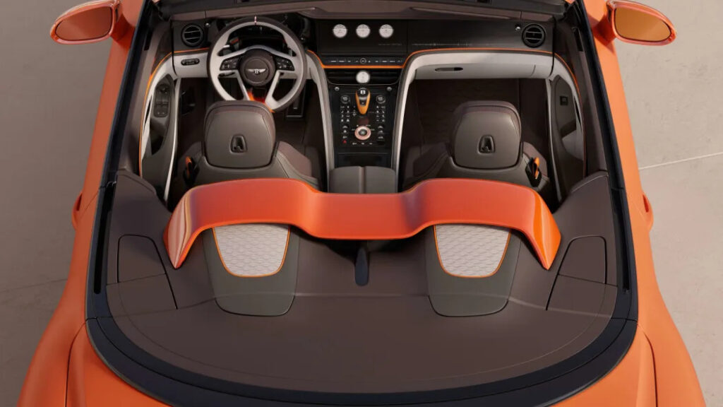 Its interior features limitless customization options, and Bentley says its design is inspired by the wraparound interior seen in the Bacalar. It’s revealed via an electronically operated soft top that goes down in 19 seconds at speeds up to 30 mph. Essentially every surface of the interior is customizable in both color and finish, Bentley says. It highlights the use of 3D-printed rose gold that’s seen on the engine start/stop buttons, drive mode selector, vent controls and as an insert on the steering wheel itself. In case you were curious, the gold comes from the centuries-old Jewelry Quarter of Birmingham, England.